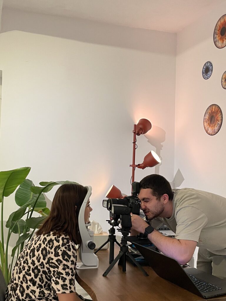 Sergiu: “Așa cum Alice e pasionată de ochi, așa și eu am încă din liceu pasiunea pentru fotografie, cât și pentru editare foto-video, pasiune pe care am antrenat-o și mai mult de când avem studioul și dispozitivele potrivite. A ajutat mult si că o parte din aparatură o aveam deja și că am abordat totul structurat. Am făcut peste o mie de poze pe ochii lui Alice ca să găsim setările prin care blițul să fie cât mai puțin deranjant, dar și calitatea pozelor ochilor să fie superioară față de ce am văzut în străinătate.“